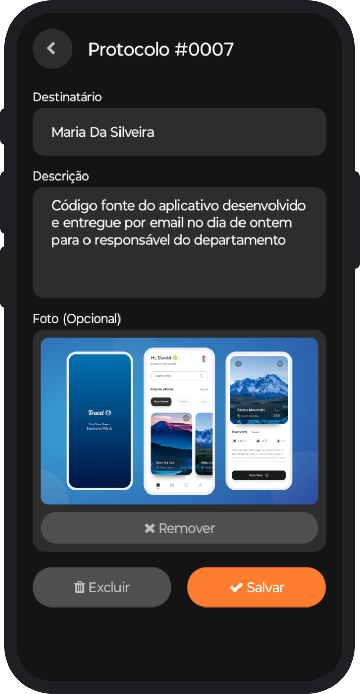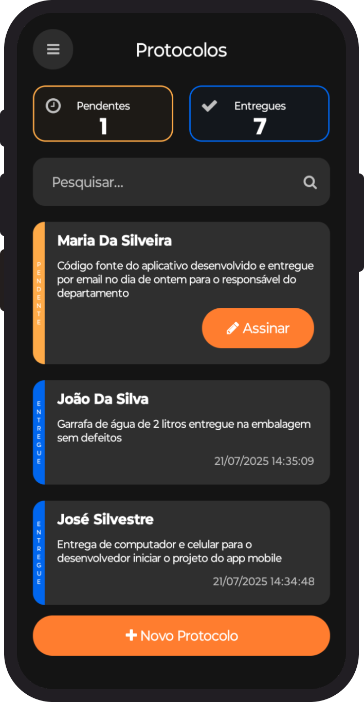 Registre protocolos com fotos e assinatura diretamente na tela — sem papel, sem complicação e mesmo offline.